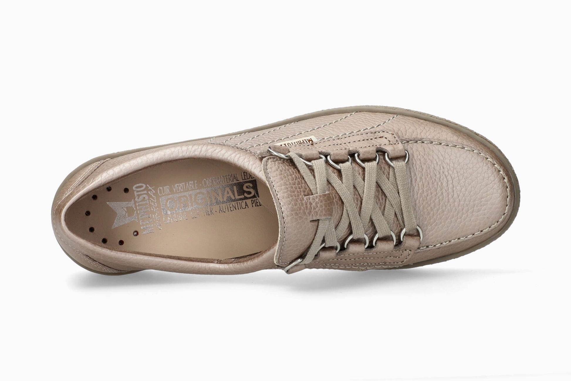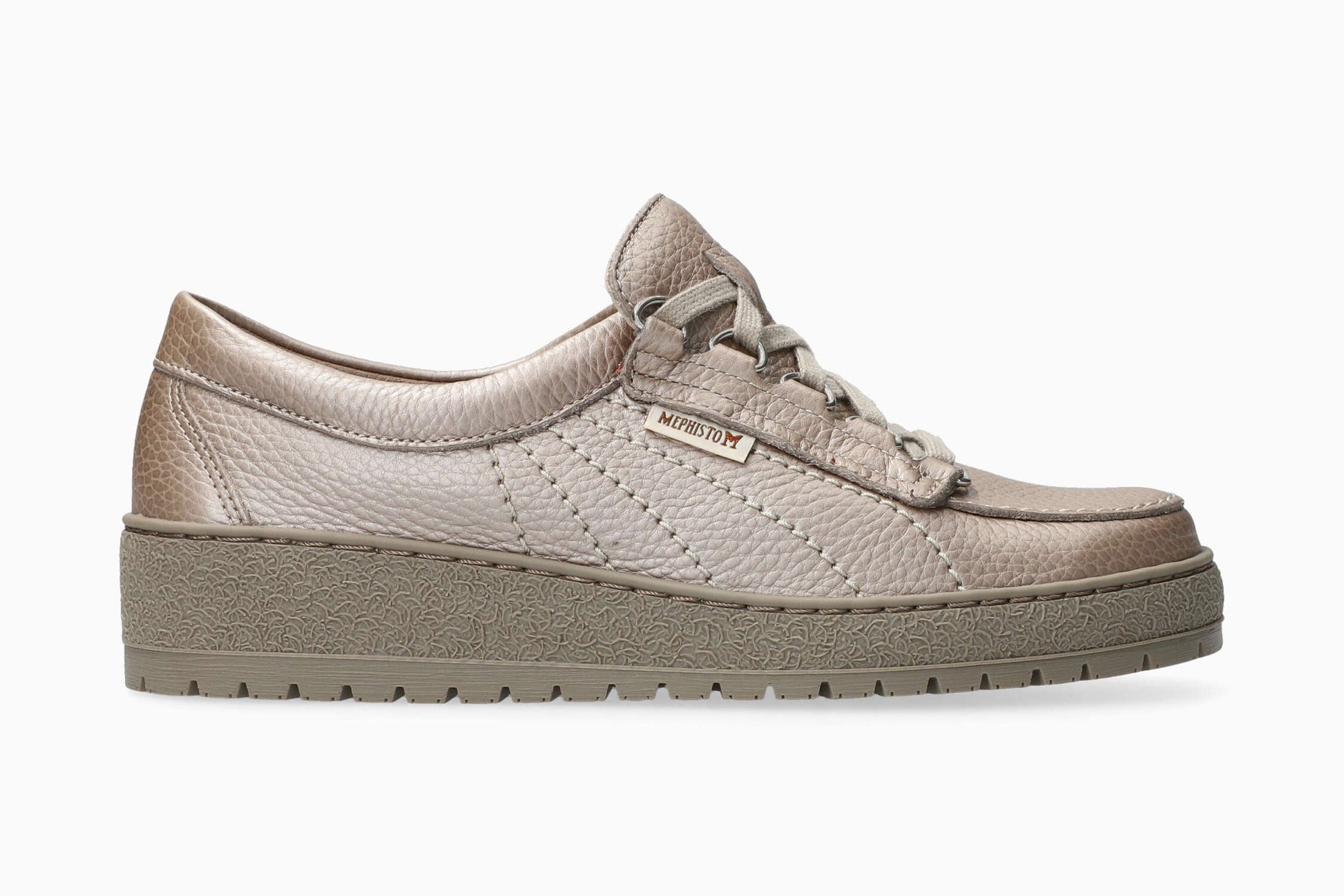 Modell LADY der Marke MEPHISTO: Ein Must-have, dieser ultraleichte California-Schuh verleiht Ihrem Outfit Charakter. Dieses graue ORIGINALS-Modell für Damen besteht aus genarbtem Leder mit Metallic-Effekt.