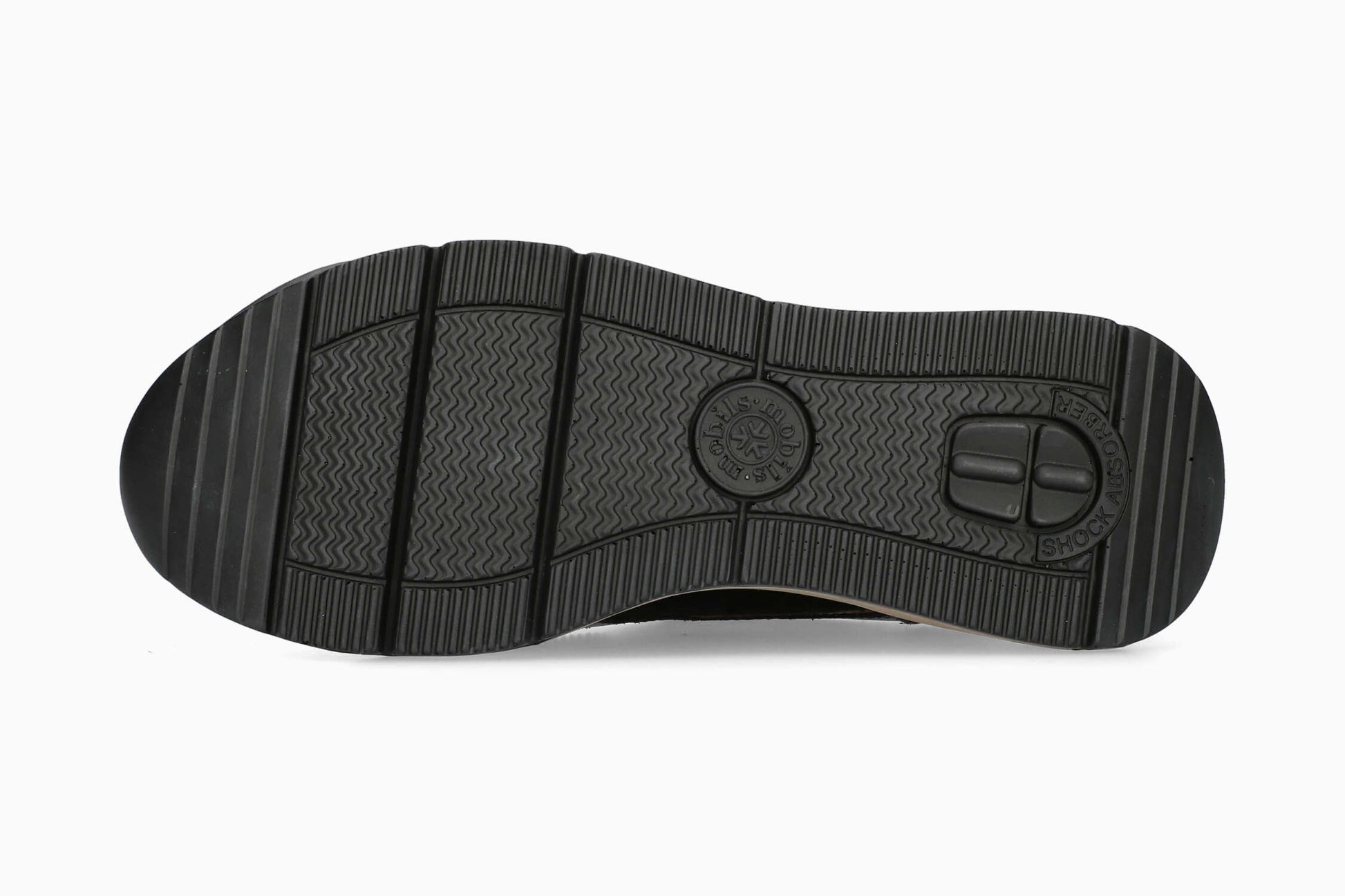 Ein Muss für alle Sneaker-Fans. Die herausnehmbare Einlegesohle mit SOFT-AIR Technologie und der SHOCK-ABSORBER in der Außensohle tragen dazu bei, Stöße auf ein Minimum zu reduzieren und sorgen so für ein sanftes und ermüdungsfreies Gehen. Zusätzlich zur Schnürung gibt es einen seitlichen Reißverschluss, der einen leichten und mühelosen Einstieg in den Schuh ermöglicht. Dieser mit Leder gefütterte Schuh garantiert eine hervorragende Passform und optimalen Komfort. Dieses schwarze Damenmodell besteht aus Veloursleder über den gesamten Fuß mit Einsätzen aus Glattleder und geknittertem Lackleder.