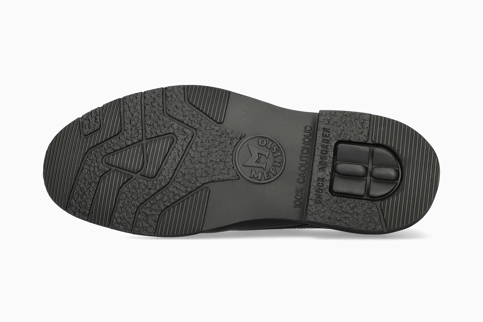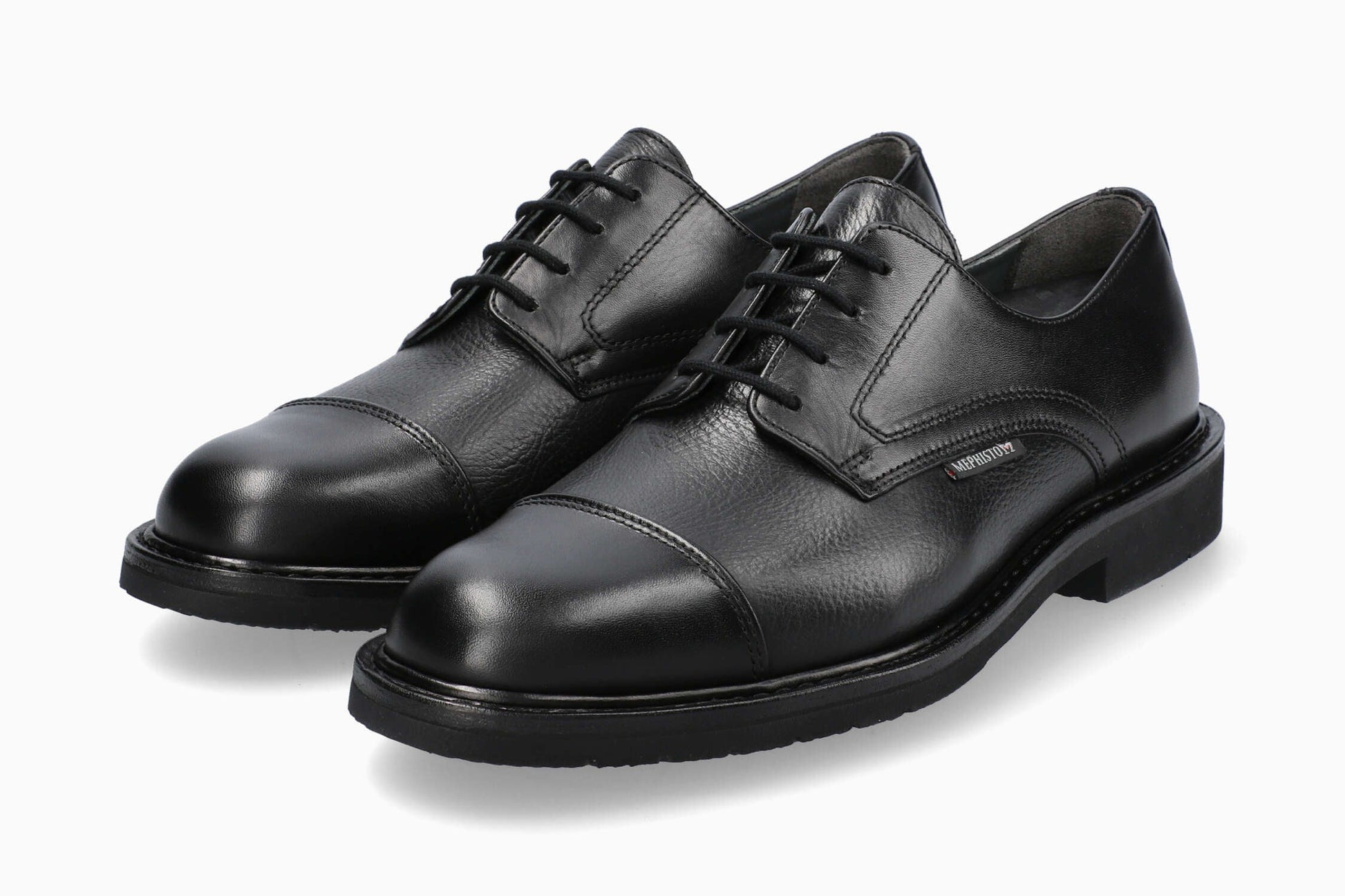 Modell MELCHIOR der Marke MEPHISTO: Die Goodyear-welted-Machart ist ein Herstellungsverfahren, mit dem eine einzigartige Passform für ein moosweiches Gehen ohne Ermüdung erreicht werden kann. Das Lederfutter sorgt für ein gesundes Klima im Inneren des Schuhs. Dieses schwarze Herrenmodell besteht im vorderen und hinteren Fußbereich aus Glattleder und an den Seiten aus genarbtem Glattleder.