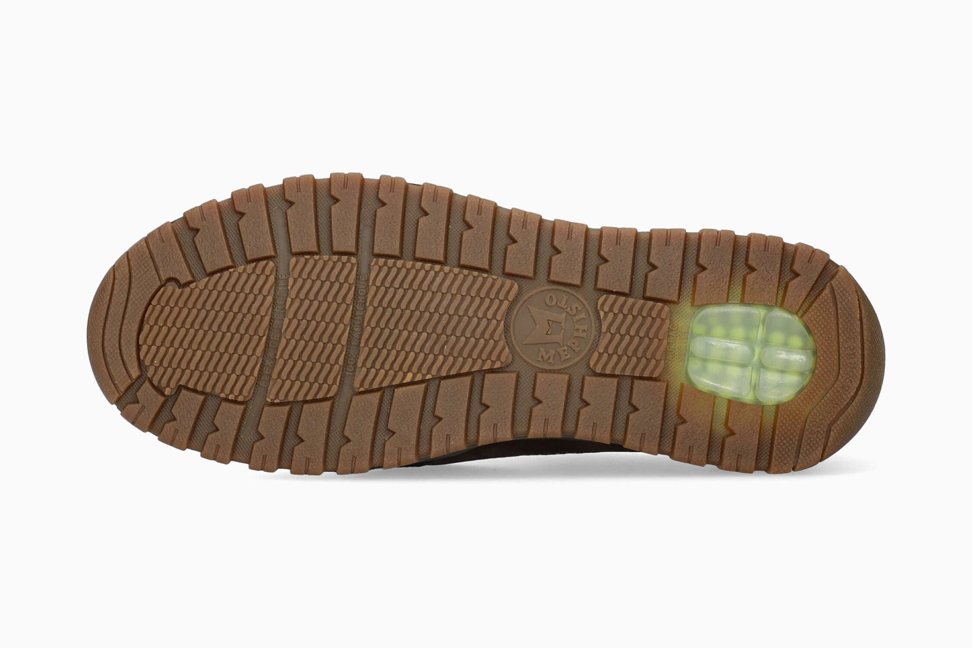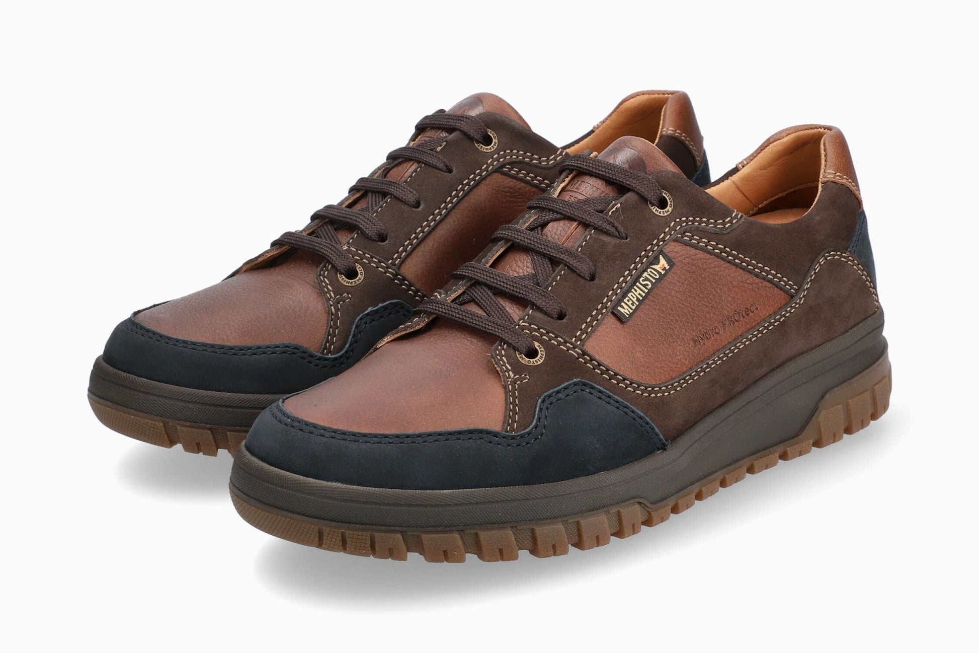 Modell PHIL der Marke MEPHISTO: Bei diesem robusten und bequemen Schuh ist eine perfekte Passform und optimaler Komfort gewährleistet. Dieses braune Herrenmodell ist aus genarbtem Glattleder im seitlichen und vorderen Fußbereich gefertigt und hat einige Partien aus Nubukleder, die über den gesamten Schuh verteilt sind.