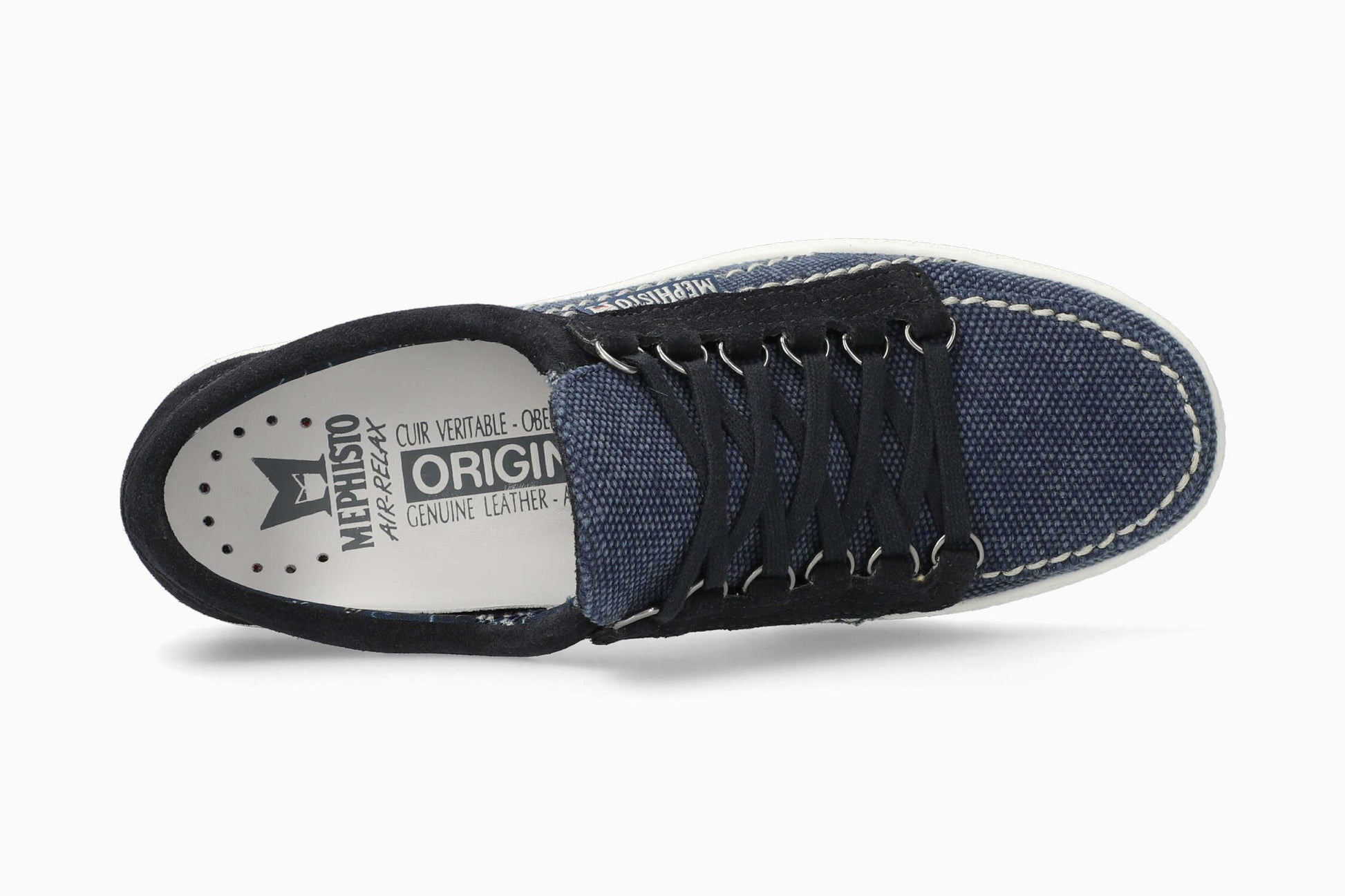 Modell RAINBOW SUN der Marke MEPHISTO : Dieses Modell mit Schnellschnürung ist ein großer Klassiker der Marke: sein Ruf ist nicht mehr zu übersehen. Das Modell ORIGINALS in Blau für Herren besteht aus einfarbigem, texturiertem Textil über den gesamten Fuß und aus Veloursleder, das in kleinen Punkten über den gesamten Fuß verteilt ist.