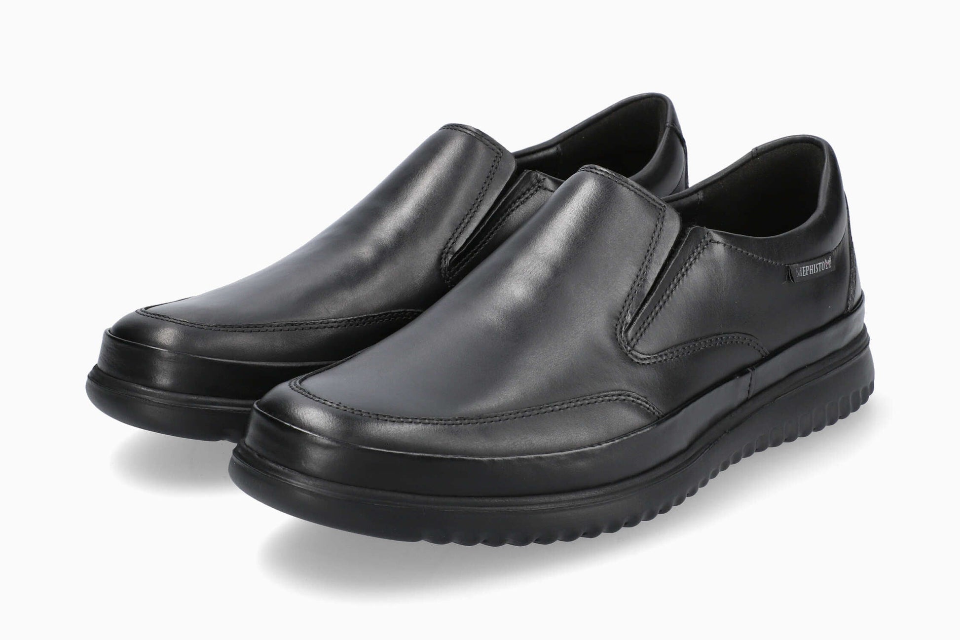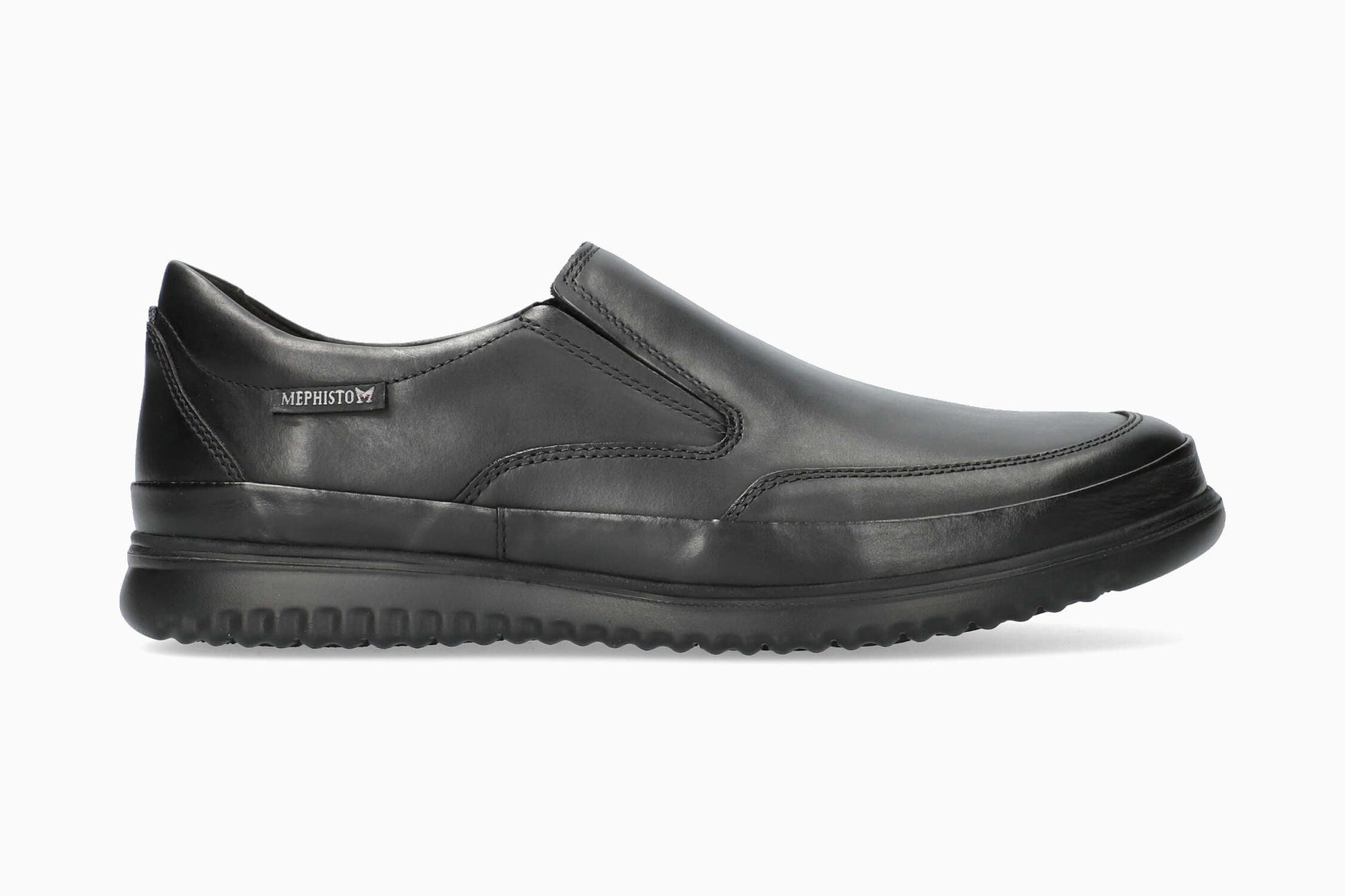 Modell TWAIN der Marke MEPHISTO: Dieser ultraleichte Slipper überzeugt mit seinem unvergleichlichen Tragekomfort. Dieser Herrenschuh im legeren Look ist aus schwarzem Glattleder gefertigt.
