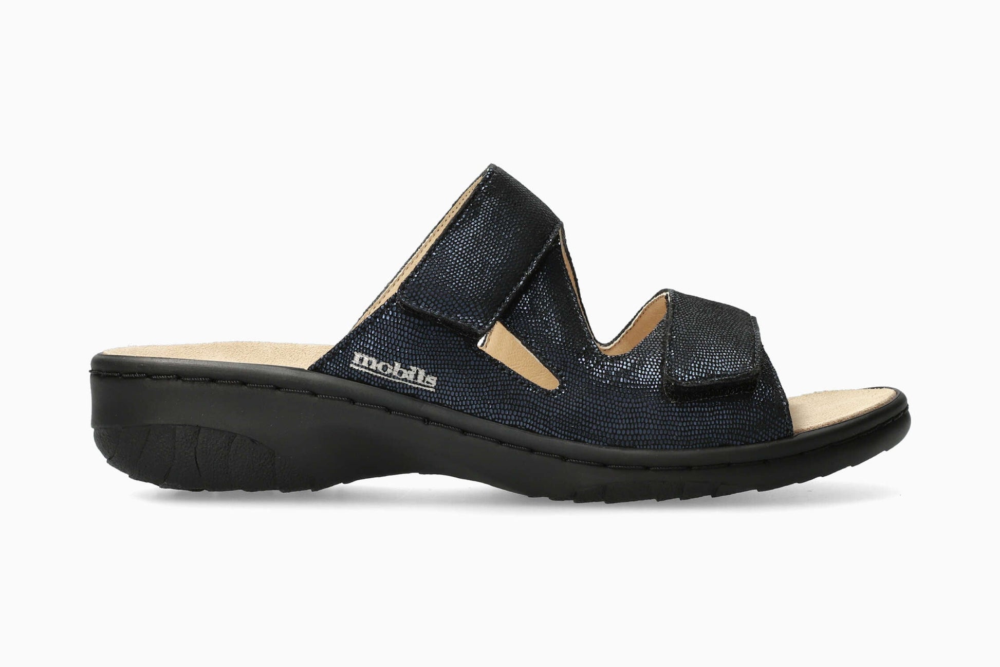 Modèle GEVA de la marque MOBILS : Pratique et confortable, cette mule vous accompagnera aussi bien au quotidien que lors de vos occasions plus habillées. La doublure en cuir assure une hygiène saine du pied. Cette mule bleue pour femme est composée de cuir effet métallisé pailleté.