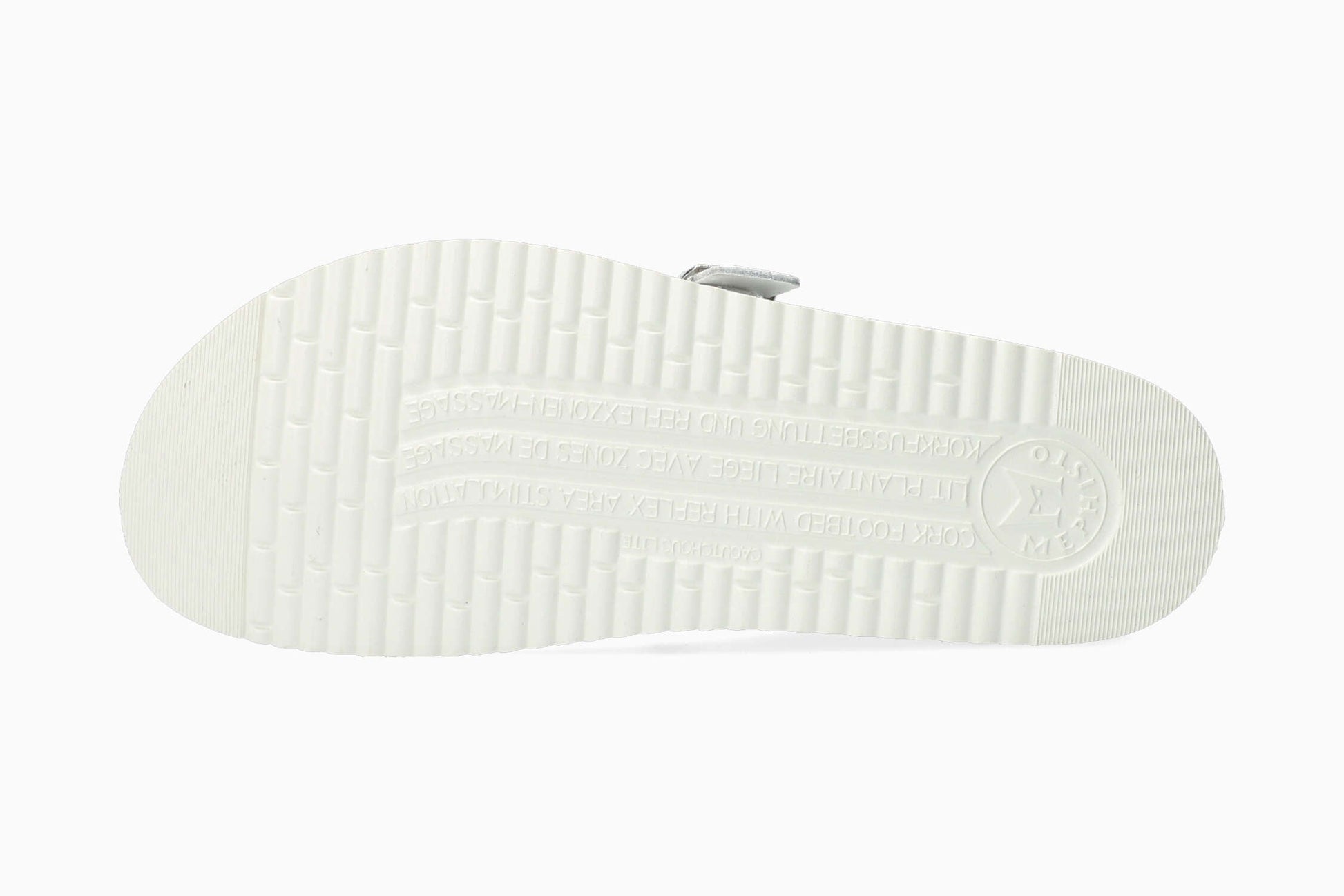 Modèle HELEN de la marque MEPHISTO : Cet entre-doigt iconique au look décontracté, offre une parfaite sensation de bien-être. L'ajustement au pied est assuré par la fermeture à boucle. Cette sandale blanche pour femme est composée de cuir effet métallisé impression fantaisie.