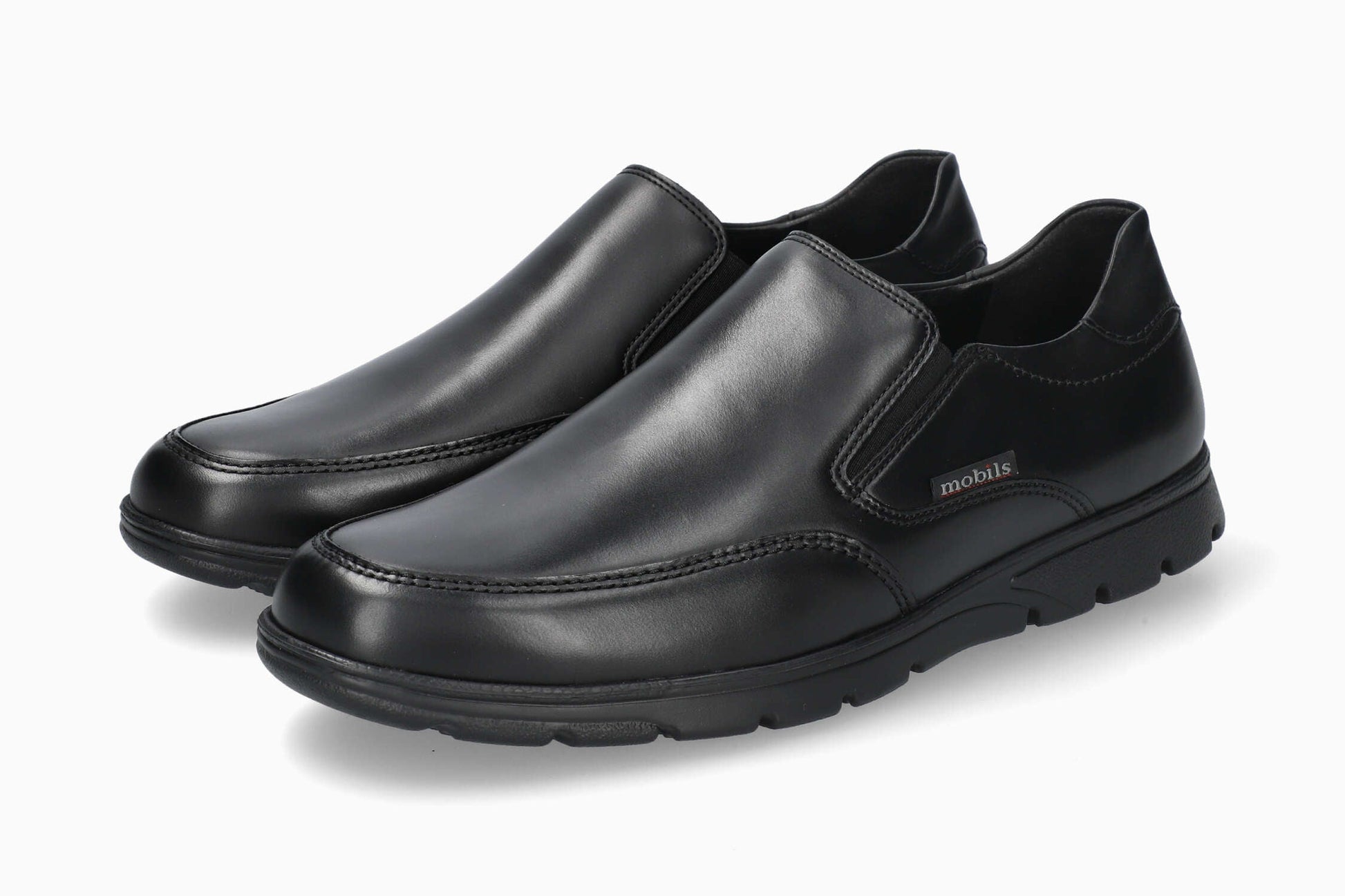Un slip-on très confortable au look décontracté. La semelle intérieure amovible qui intègre la SOFT-AIR Technologie garantit une marche souple et sans fatigue. Tous les modèles MOBILS ergonomic sont conçus avec un supplément de largeur et offrent ainsi plus de place à l'avant des chaussures. Slip-on avec élastiques sur le haut de pied pour un maintien parfait du pied. La doublure en cuir offre un climat sain à l'intérieur de la chaussure. Ce slip-on noir pour homme est composé de cuir lisse.