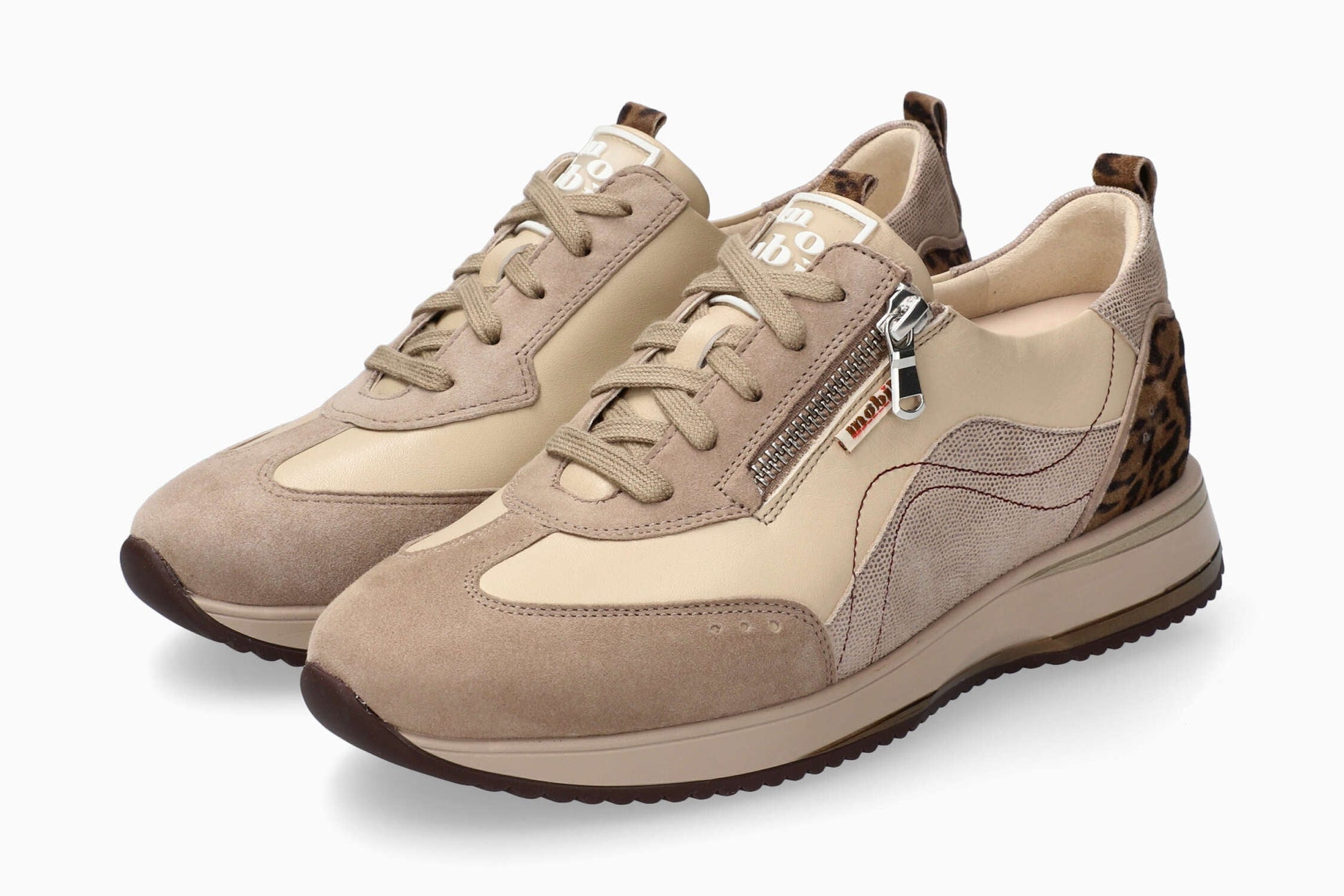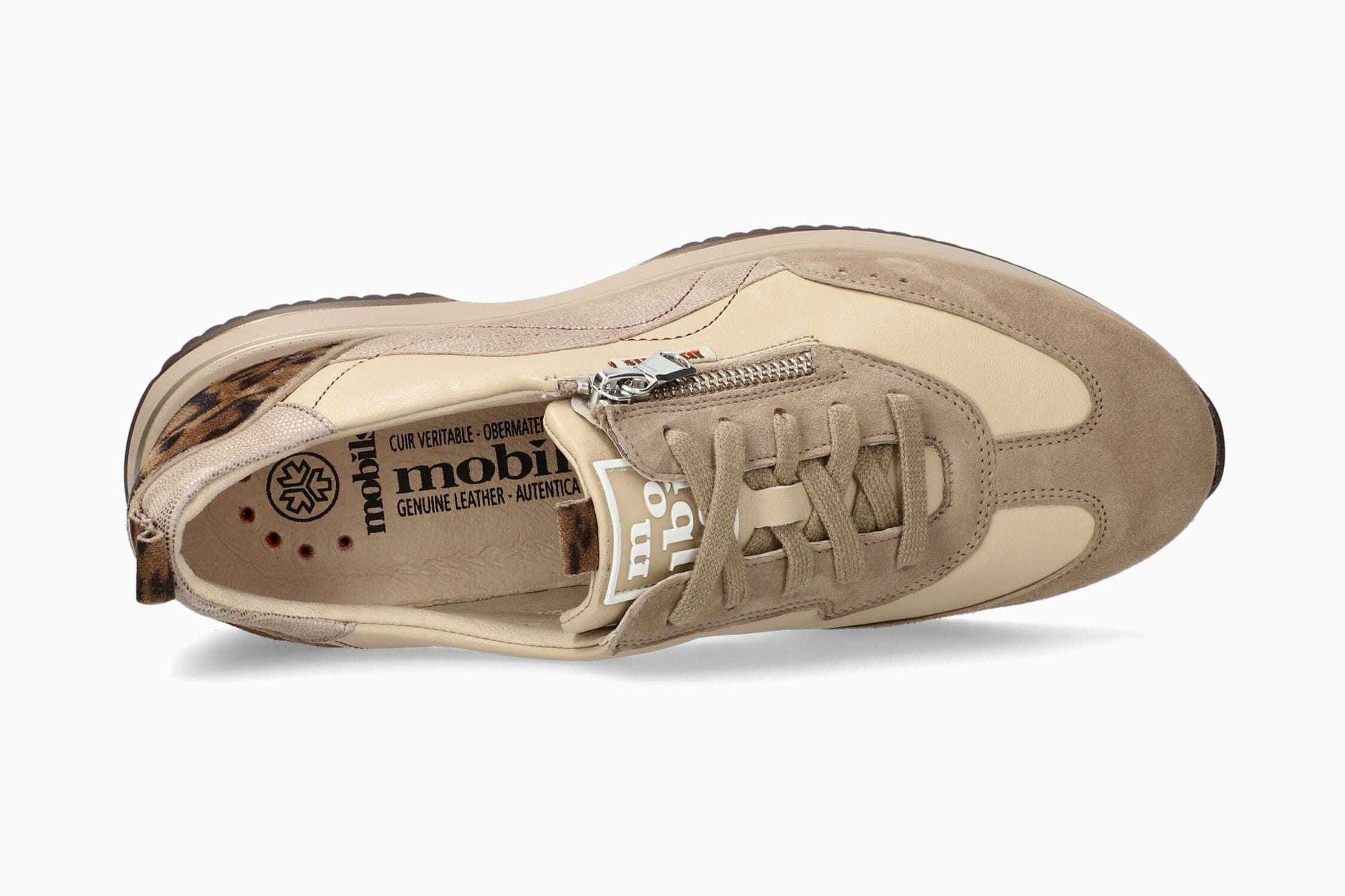 Modèle NESS de la marque MOBILS : Cette chaussure au look sport garantit un excellent chaussant. Sa doublure en cuir procure un climat sain à l'intérieur de la chaussure. Ce modèle beige pour femme est composé de cuir lisse sur l'ensemble du pied avec des empiècements en cuir velours et en cuir effet métallisé pailleté.