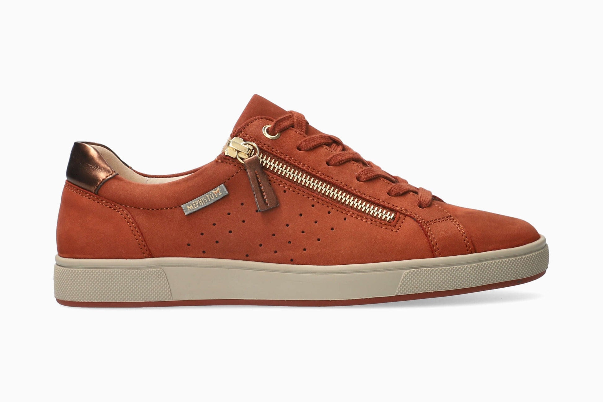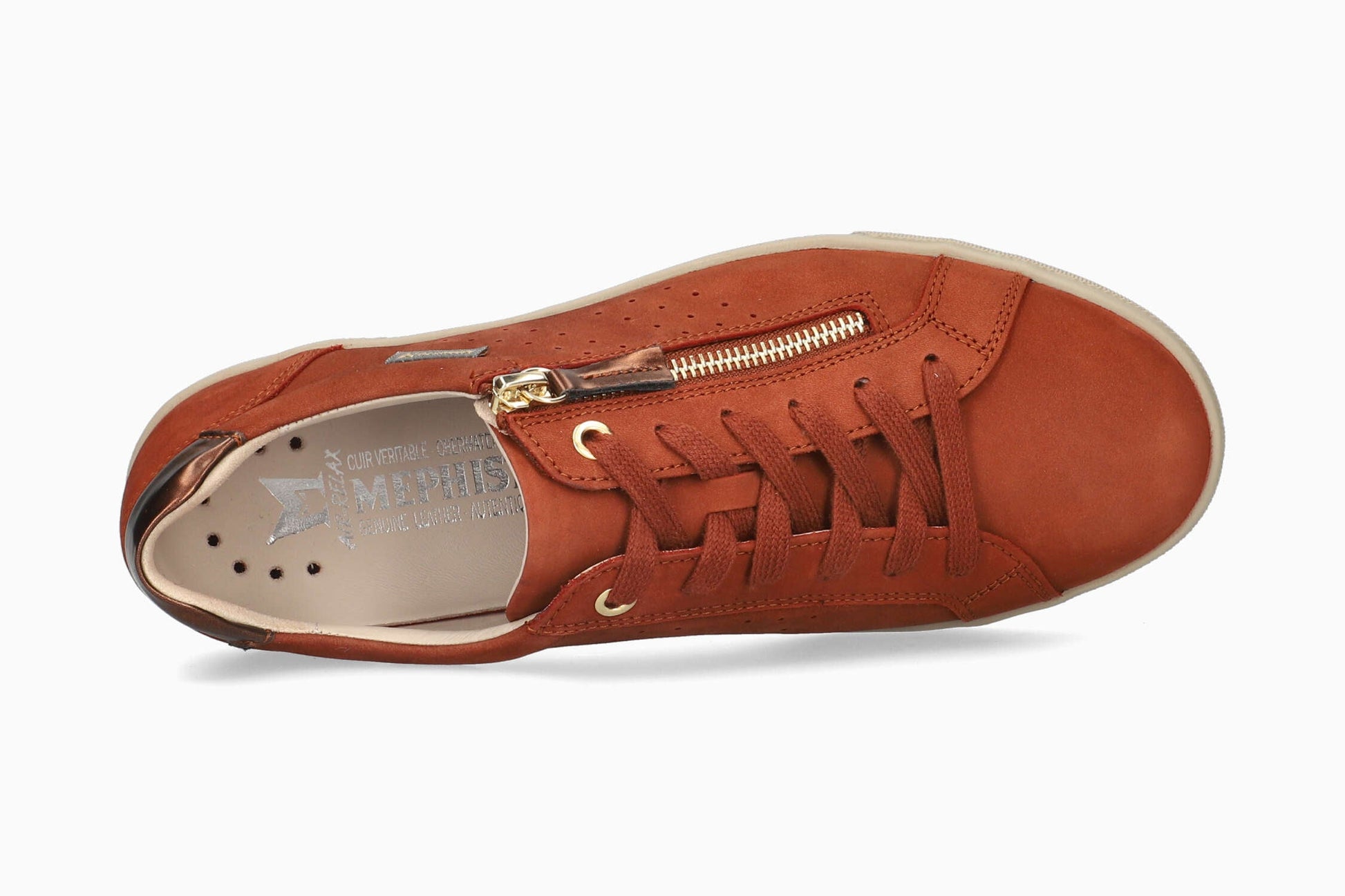 Modèle NIKITA de la marque MEPHISTO : Ce sneaker confortable est un indémodable qui s'accordera à toutes vos tenues, aussi bien en terme de couleur que de ligne épurée. Ce sneaker marron orangé pour femme est composé de cuir nubuck sur l'ensemble du pied et de textile effet métallisé brillant sur l'arrière du pied.