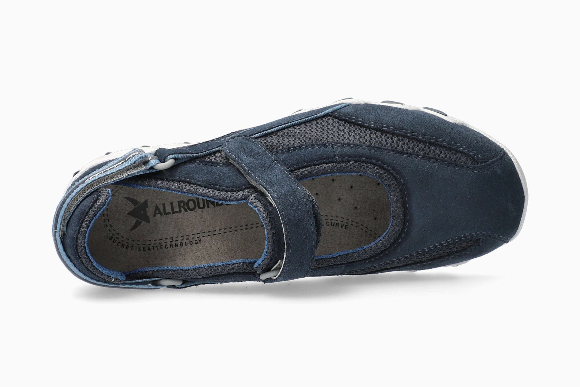 Modèle NIRO de la marque ALLROUNDER : Avec cette chaussure vous surmonterez les défis du quotidien. La bride réglable et auto-agrippante, permet un ajustement et un confort parfait. Cette chaussure pour femme dans un beau bleu se distingue surtout par son design sportif et la qualité de la matière en velours.