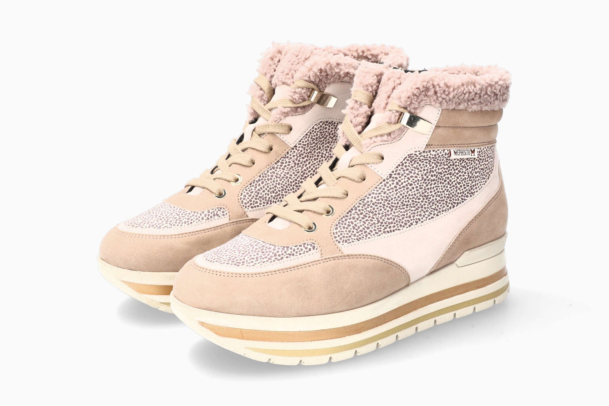 Cette chaussure montante à l'allure sportive et féminine, se distingue par son design à plateforme. La semelle intérieure amovible qui intègre la SOFT-AIR Technologie et le SHOCK-ABSORBER présent dans la semelle extérieure, réduisent les chocs au minimum pour une marche souple et sans fatigue. En plus du laçage, une fermeture à glissière latérale permet de rentrer aisément et sans effort dans la chaussure. Sa doublure douce et chaude assure un confort optimal. Ce modèle beige pour femme allie cuir velours sur l'ensemble du pied avec des empiècements en cuir velours imprimé imitation animal et en cuir nubuck.