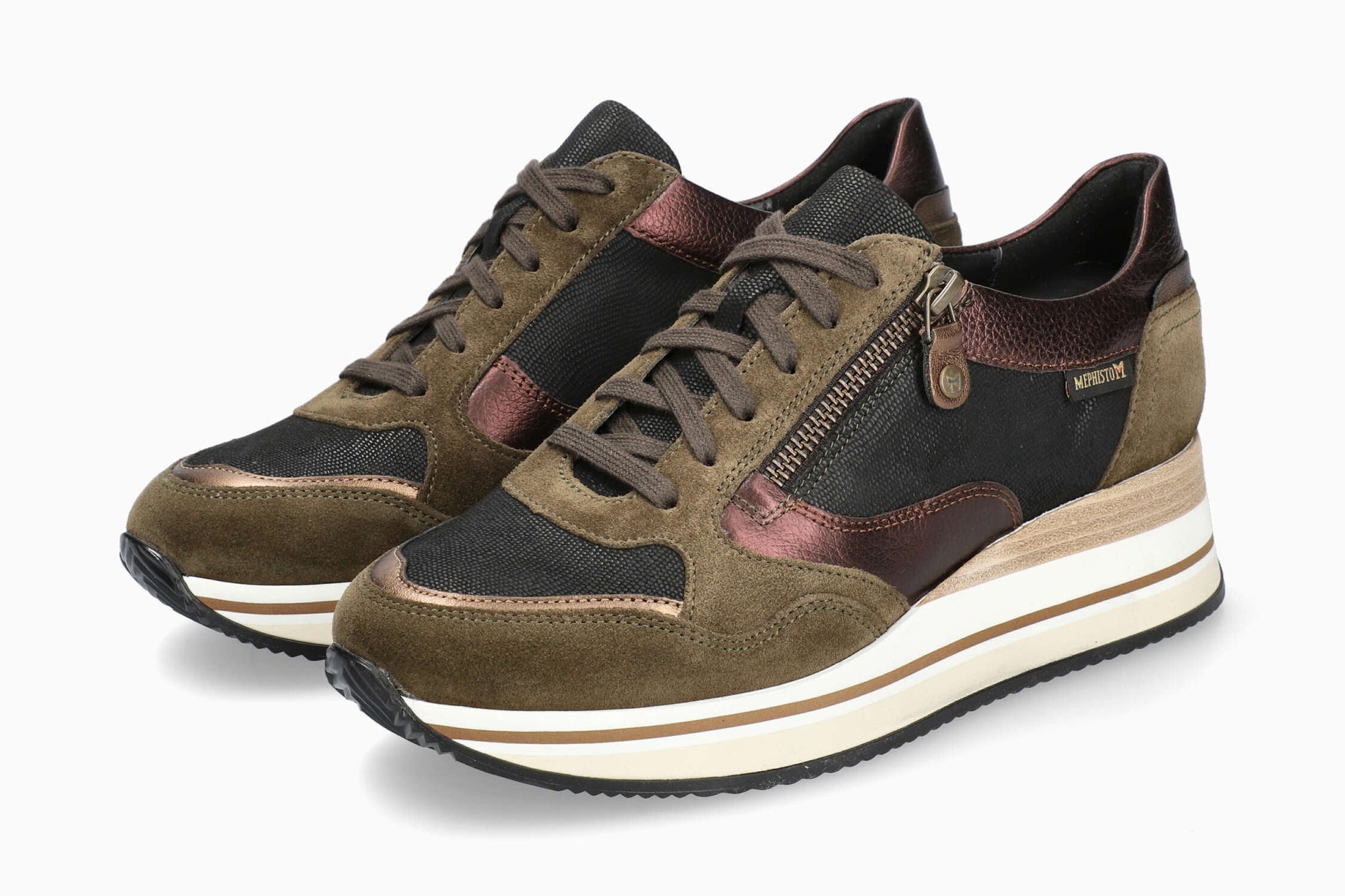OLIMPIA van MEPHISTO: Deze trendy sneaker biedt optimaal comfort en een uitstekende pasvorm. De leren voering zorgt voor een gezond klimaat in de schoen. Deze groene damessneaker combineert suèdeleer over de hele voet met leer met metallic-effect en inzetstukken van glad generfd leer.
