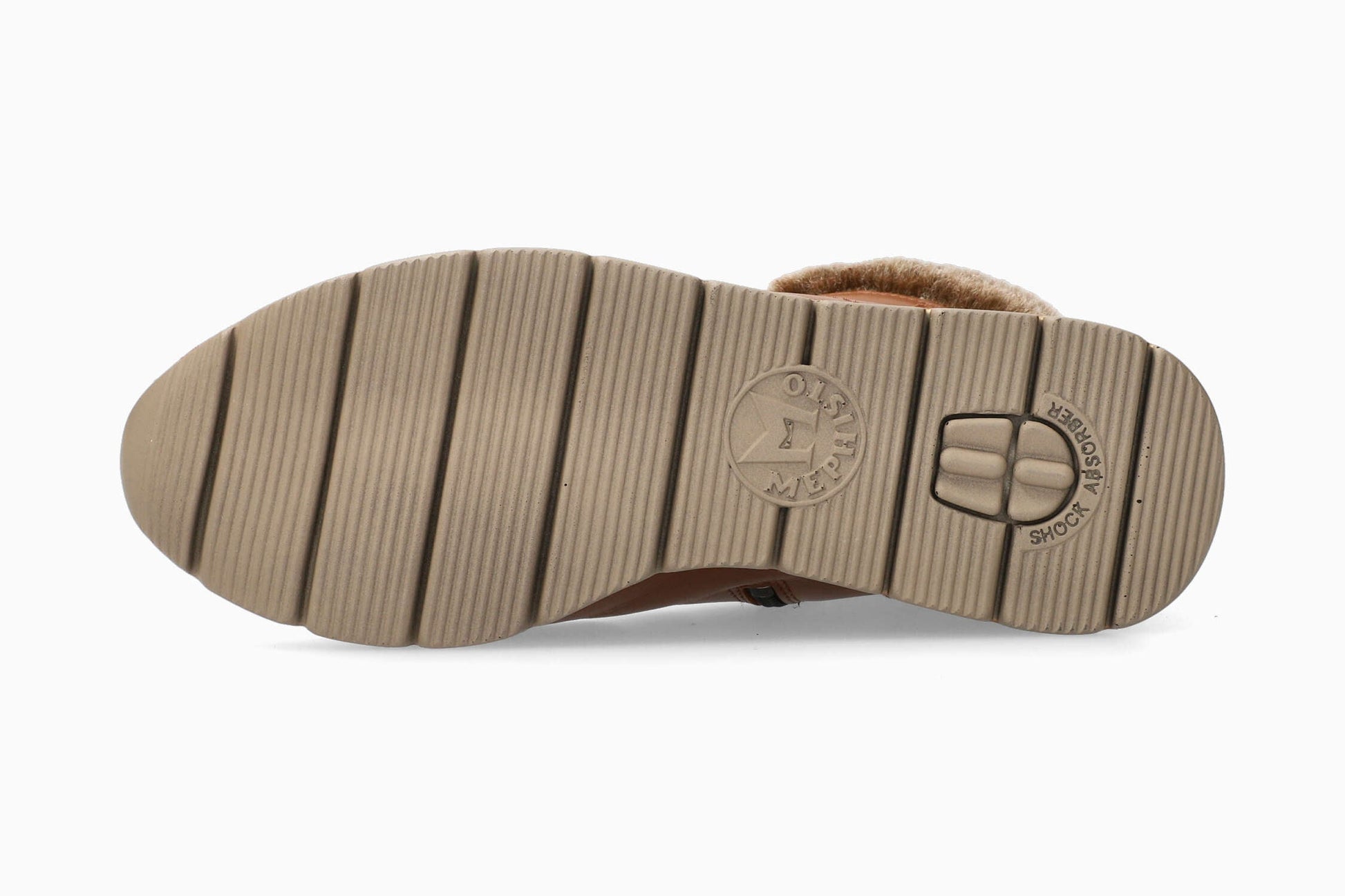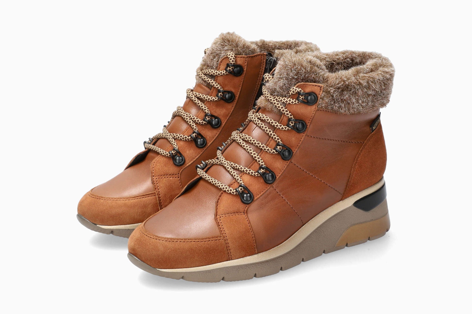 Deze bootie met sleehak staat garant voor een uitstekende pasvorm en optimaal comfort. De uitneembare binnenzool is voorzien van SOFT-AIR Technology en SHOCK-ABSORBER in de zool, waardoor schokken tot een minimum worden beperkt voor soepel en moeiteloos lopen. Naast het vetersysteem zorgt een rits aan de zijkant ervoor dat je de schoen gemakkelijk en moeiteloos aan kunt trekken. De zachte, warme voering biedt thermisch comfort voor je voeten. Dit bruine damesmodel is gemaakt van glad en suède leer.